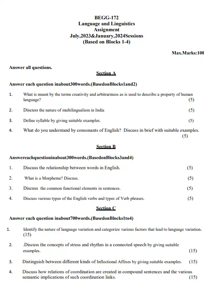 This is a Core Course for students who have opted program BAG under IGNOU BEGG 172 Language and Linguistics 2023-2024 With CBCS Pattern. We Provide the All Assignment Questions And Their Solutions.