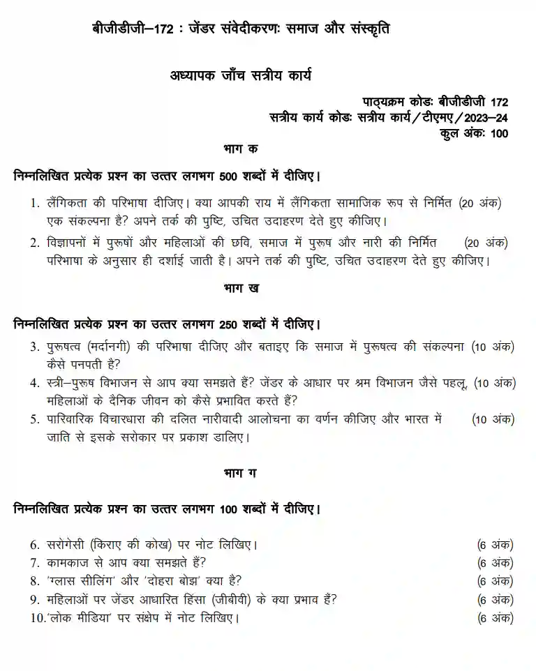 This is a Core Course for students who have opted program BSCANH under IGNOU BGDG 172 Gender Sensitization: Society and Culture 2023-2024 With CBCS Pattern.