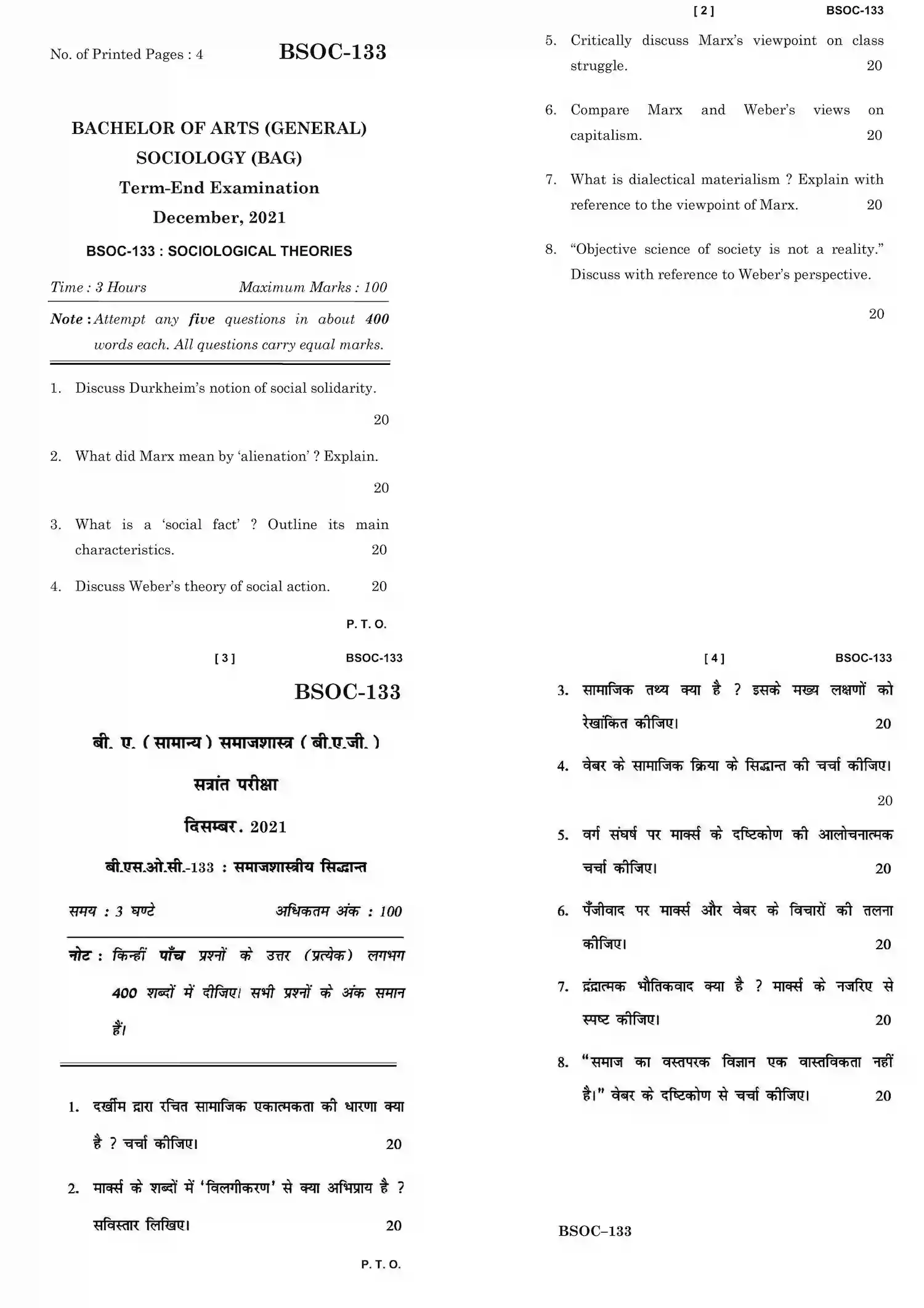 Download BSOC 133 Question Paper Official Site