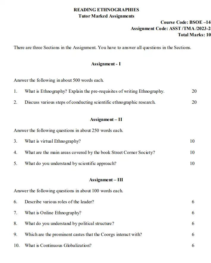 This is a Core Course for students who have opted program BAG under IGNOU BSOE 144 Reading Ethnographies 2023-2024 With CBCS Pattern. We Provide the All Assignment Questions And Their Solutions.